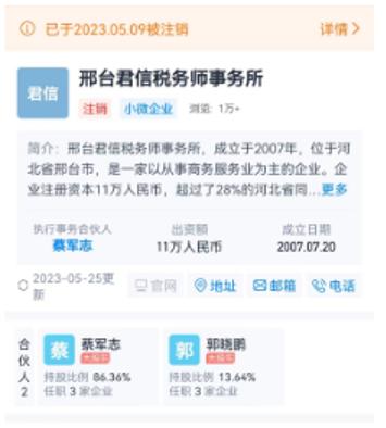 但據《天眼查》顯示,蔡軍志此前還是“邢臺君信稅務師事務所”的執行事務合夥人,這家機構成立於2007年,後於2023年5月註銷,截止到註銷時蔡軍志仍爲該機構的執行事務合夥人,這與招股書中披露的“2015年3月至2016年8月自由職業”的信息不符,而且蔡軍志在2016年9月開始擔任公司財務總監之後,仍然長期從事稅務師事務所執行事務合夥人的工作,這也有悖常理。