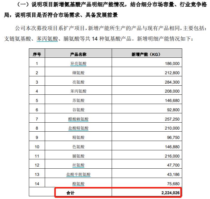 無錫晶海本次申請上市的主要募投項目爲“高端高附加值關鍵系列氨基酸產業化建設項目”,由無錫晶海全資子公司晶泓科技作爲實施主體,項目投資總額爲30993.06萬元,根據《審覈問詢函的回覆》第293頁披露,本次募投項目系擴產項目,新增產能所生產的產品與現有產品相同,主要包括:支鏈氨基酸、苯丙氨酸、脯氨酸等共14種氨基酸產品,合計新增產能2224026千克,也即2224噸。