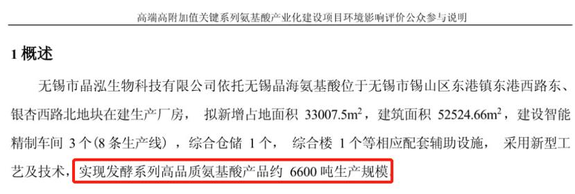 但是根據公開的《高端高附加值關鍵系列氨基酸產業化建設項目環境影響評價公衆參與說明》,該項目“實現發酵系列高品質氨基酸產品約6600噸生產規模”,這相當於公司公開信息披露的三倍。
