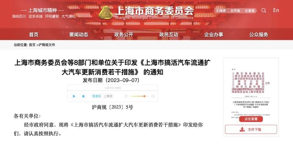 上海市商務委員會等8部門和單位9月7日發佈了《上海市搞活汽車流通擴大汽車更新消費若干措施》 (以下簡稱《若干措施》)。
