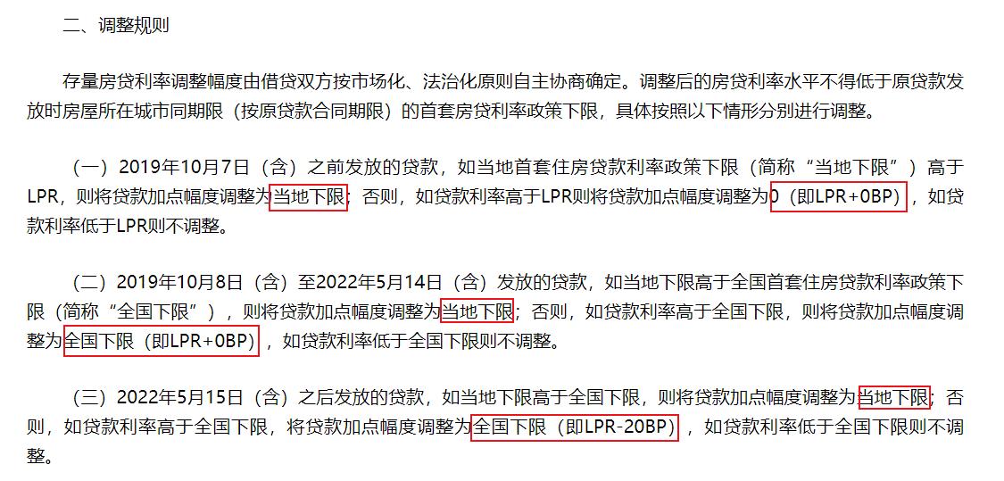 從調整規則來看,根據貸款發放時間,調整分成三類:一是2019年10月7日(含當日)之前發放的,貸款加點幅度可降至當地下限或者LPR。二是2019年10月8日(含當日)至2022年5月14日(含當日)發放的,貸款加點幅度最低降至當地下限或者全國下限(即LPR)。三是2022年5月15日(含當日)之後發放的,貸款加點幅度最低降至當地下限或者全國下限(即LPR-20BP)。如果貸款利率已經低於LPR或全國下限,則不調整。
