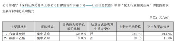 與此對應的還有珠海賽緯的同行業可比公司瑞泰新材,該公司也在2022年年報中披露當年六氟磷酸鋰採購均價,上半年和下半年分別爲23.47萬元/噸和21.5萬元/噸,也明顯低於珠海賽緯披露的採購價格。
