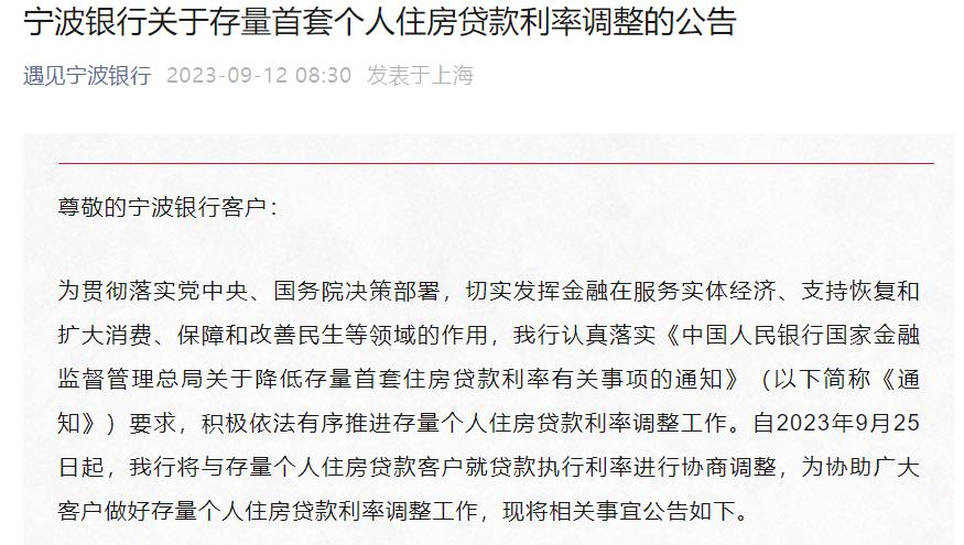 9月13日,據記者不完全統計,寧波銀行、青島銀行、南京銀行、東莞銀行、天津農商銀行、成都農商銀行、漢口銀行、重慶銀行、唐山銀行、寧夏銀行、廣州農商行、承德銀行、無錫農村商業銀行、河北銀行等近50家銀行發佈《關於明確存量首套住房貸款利率調整相關事項的公告》。