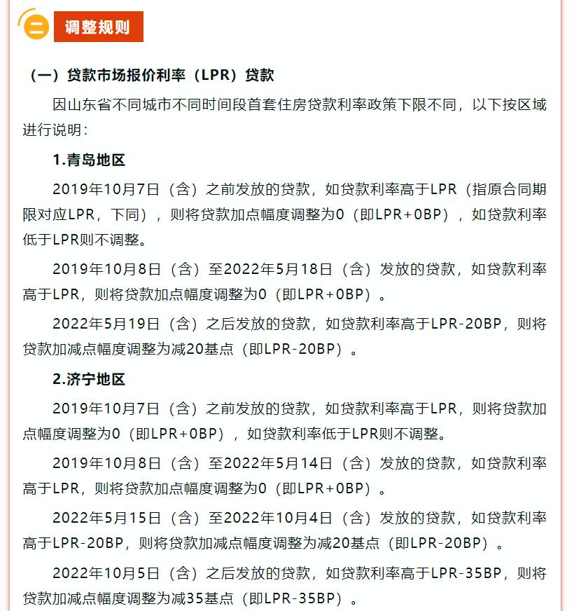 調整規則方面,按照城市政策不同進行說明。比如青島銀行在公告中表示,因山東省不同城市不同時間段首套住房貸款利率政策下限不同,按區域說明,包括青島地區、濟寧地區和山東省內其他地區(不含青島、濟寧)。主要區別是貸款發放日期的劃分。