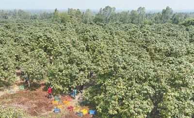 距離布南的芒果園約10公里處,便是他的老客戶——遼寧中上國際貿易有限公司的芒果加工包裝車間,這裏加工的芒果主要銷往中國華北、東北地區。佔地7000平方米的車間內,近70名柬埔寨工人正有條不紊地對芒果進行處理和包裝。據介紹,一顆剛採摘下來的新鮮芒果,48小時內經過多道工序處理,才能進入冷鏈運輸並出口海外。柬埔寨姑娘黎丹是車間主任。她告訴記者,中國市場對芒果品質要求高,這無形中提高了柬埔寨芒果從種植到加工、包裝等各個環節的生產標準。