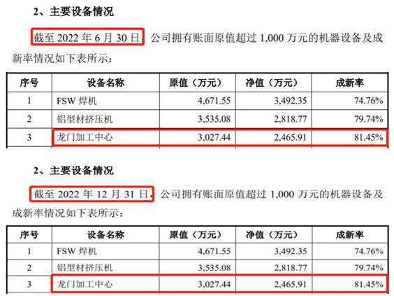 而且在2022年12月發佈的招股書中還披露,2022年上半年公司的理論產能爲29.07萬套,2023年9月發佈的最新版招股書披露2022年全年的理論產能爲83.83萬套,也即2022年下半年的理論產能超過了50萬套,較上半年顯著增加。在此基礎上公司擁有的龍門加工中心設備數量也應當是增加的。也即,公司在2022年末的龍門加工中心設備,不論是賬面原值還是資產淨值還是成新率,都不可能與2022上半年末保持一致。