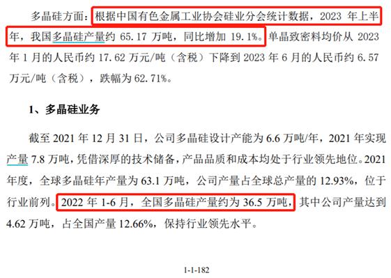 新特能源的控股股東爲A股上市公司特變電工,根據特變電工此前發佈的2023年半年報第272頁披露,根據中國有色金屬工業協會硅業分會統計數據,2023年上半年我國多晶硅產量約65.17萬噸、同比增加19.1%。由此計算2022年上半年我國多晶硅產量約爲52.72萬噸。但與此同時,新特能源在此前於2022年11月發佈的招股書第182頁披露:2022年1-6月,全國多晶硅產量約爲36.5萬噸,其中公司產量達到4.62萬噸,佔全國產量12.66%,保持行業領先水平。對比新特能源和特變電工的信息披露,針對2022年上半年我國多晶硅產量數據存在明顯差異,差異產量高達15萬噸以上。