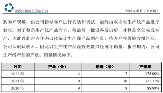 另據招股書披露的產銷量數據顯示,亞聯機械在2021年的產量和銷量分別爲9臺和10臺,2022年分別爲4臺和7臺,兩年的產銷差對應的產成品庫存淨減少數量分別爲1臺和3臺,2022年是2021年的三倍。在此基礎上,亞聯機械的產成品(連同發出商品)在2020年到2022年末的賬面餘額分別爲2.41億元、2.09億元和1.55億元,2021年和2022年的產成品庫存價值淨減少金額分別爲3200萬元和4600萬元,2022年僅相當於2021年的1.5倍左右,變動幅度與同期產成品庫存淨減少數量無法匹配。
