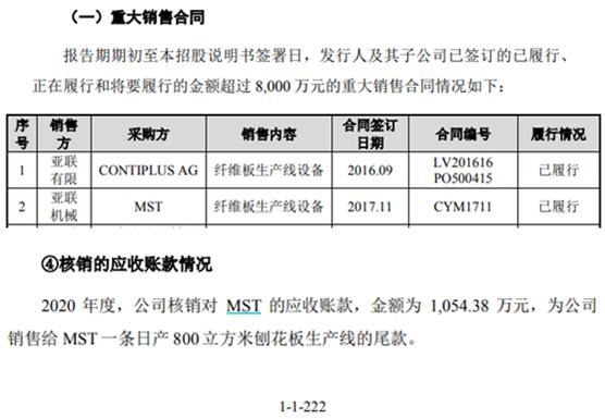 不僅如此,根據招股書第291頁披露的“發行人及其子公司已簽訂的已履行、正在履行和將要履行的金額超過8000萬元的重大銷售合同情況”,其中涉及到MST的只有在2017年11月簽訂的纖維板生產線設備,至於公司在2021年確認的、對MST的銷售1.26億元,是否有相應的重大銷售合同作爲支撐,亞聯機械並未接受記者採訪。