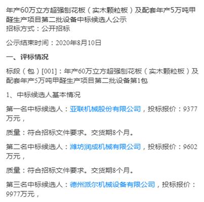 再來看亞聯機械的經營數據,公司2022年第二大客戶爲建豐新材料,金額爲8400.1萬元,包含了巴中建豐新材料有限公司和四川建豐林業有限公司,招股書披露亞聯機械是在2020年8月與巴中建豐新材料有限公司簽訂的刨花板生產線設備合同,《審覈問詢函的回覆》進一步詳細披露該項目在 2022 年 6 月達到合同約定的驗收標準,正式通過客戶驗收。根據公開“年產60萬立方超強刨花板(實木顆粒板)及配套年產5萬噸甲醛生產項目第二批設備中標候選人公示”,在該項目的投標人中,第二中標人則是亞聯機械的供應商、原參股公司的關聯方的“濰坊潤成機械有限公司”。
