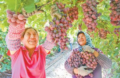 新疆維吾爾自治區昌吉回族自治州昌吉市三工鎮二工村葡萄種植基地,農戶正在採摘葡萄。