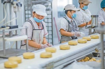 廣西壯族自治區北海市合浦縣月餅小鎮,月餅麪糰經過流水線。
