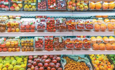 雲南省紅河哈尼族彝族自治州開遠市,超市貨架上的水果琳琅滿目。