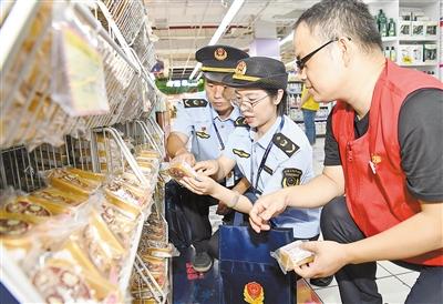 浙江省餘姚市,市場監管部門的工作人員在檢查商超月餅質量情況。