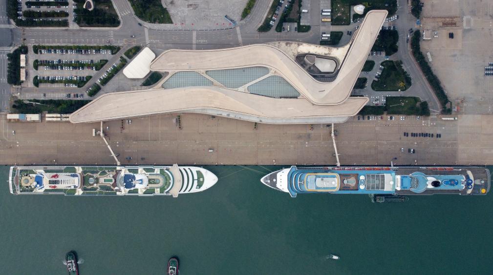 9月27日,“夢想”號郵輪(左)、“地中海”號郵輪靠泊在天津國際郵輪母港準備啓航(無人機照片)。新華社記者 趙子碩 攝