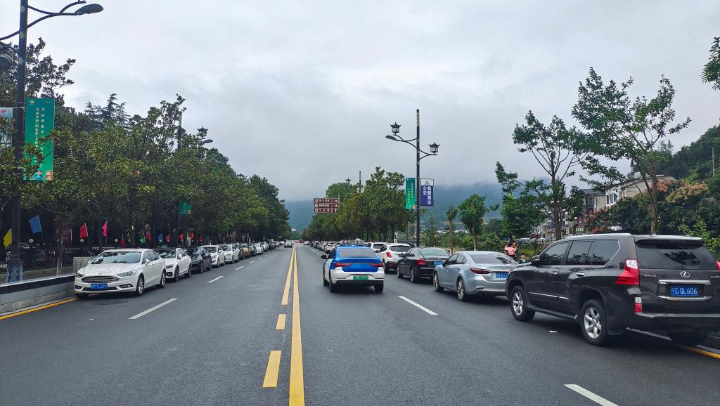 在不影響交通的前提下,車輛有序停放在武陵源城區道路旁邊。(吳勇兵攝)