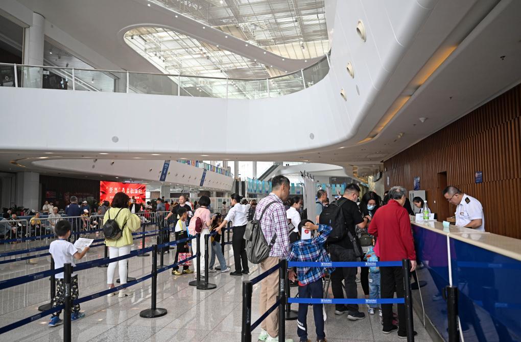 “地中海”號起航當天,天津邊檢出境大廳人潮湧動,在邊檢民警的引導下,旅客有序排隊辦理邊檢通關手續。