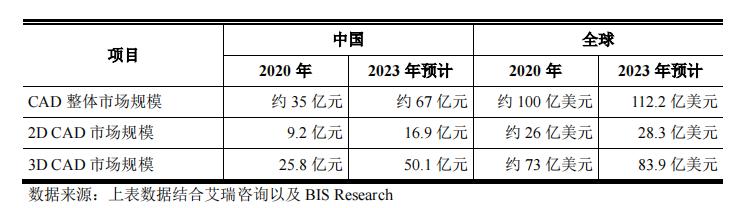 綜合艾瑞諮詢針對中國CAD市場的測算以及艾瑞諮詢、BIS Research對於全球2D CAD和3D CAD市場結構的測算,2020年和2023年中國2D CAD市場規模分別爲9.2億元和16.9億元,3D CAD市場規模分別爲25.8億元和50.1億元。
