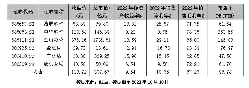 而在同業對比方面,根據主營產品及收入結構的相似性,我們選取中望軟件、金山辦公、盈建科、廣聯達、致遠互聯爲浩辰軟件的可比上市公司,wind數據統計顯示,2022年浩辰軟件的淨資產收益率、銷售淨利率、年銷售毛利率分別爲23.82%、25.87%、91.75%,均遠超平均值,位列可比公司前列,市盈率PE(TTM)爲61.64倍,低於同業均值。