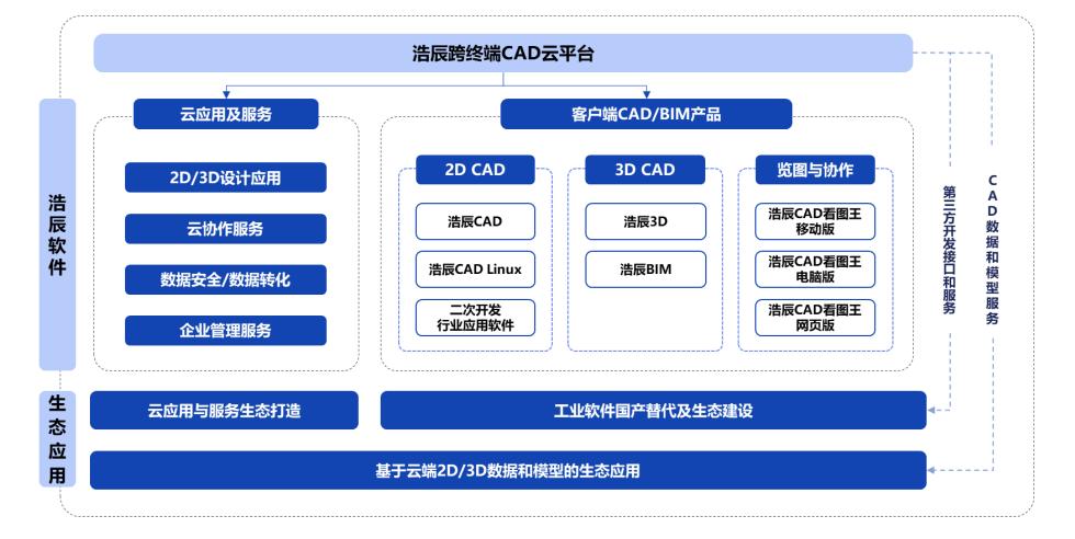 此外,浩辰軟件還着眼於CAD雲化的前瞻佈局和戰略發展,未來將打造浩辰軟件跨終端CAD雲平臺體系,提供基於雲端數據和模型的2D/3D數字化創新設計和應用,集成包括浩辰CAD、浩辰3D、浩辰BIM在內的研發設計軟件,實現各終端數據和模型上雲和互通。同時通過開發接口和服務,將廣泛的第三方應用納入雲平臺體系,打造業內雲應用與服務整體生態。浩辰CAD雲平臺將貫穿從設計、施工到運維,從設計、仿真到製造等全環節,爲用戶提供全週期一體化服務。