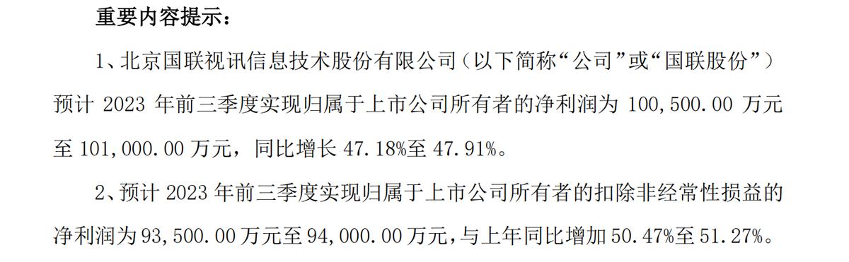 作爲國內工業電商和產業互聯網頭部企業,國聯股份日前發佈的2023年前三季度業績預告顯示,截止2023年9月30日,公司今年前三季度預計實現歸屬於上市公司股東的淨利潤約爲10.05億元—10.10億元,與上年同期相比,預計增加約3.22億元—3.27億元,同比增加47.18%—47.91%;實現歸屬於上市公司股東的扣非淨利潤預計爲9.35億元—9.40億元,同比增加50.47%—51.27%。