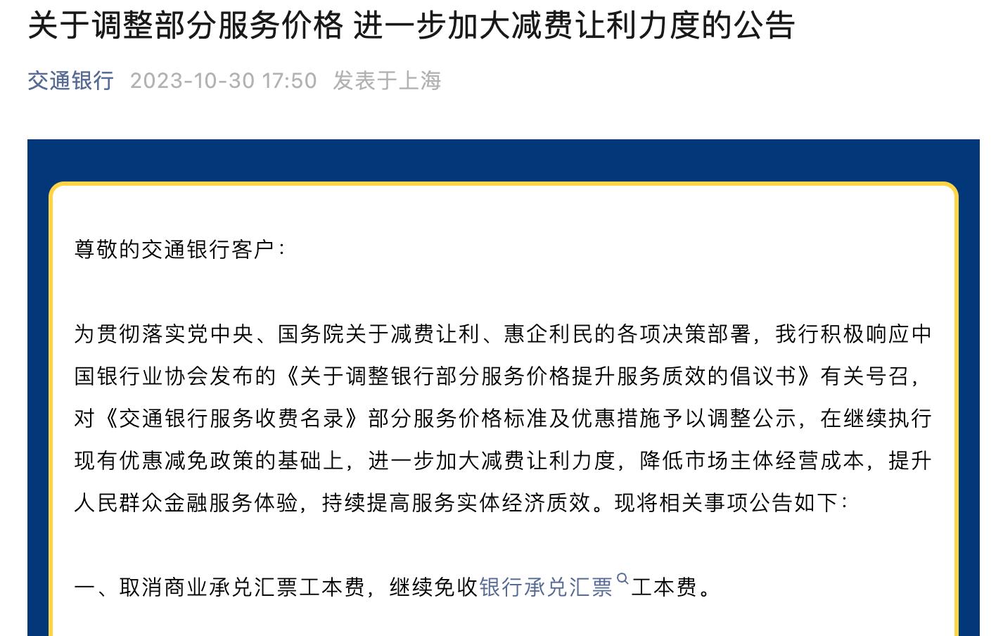 據交通銀行公告,該行一是取消商業承兌匯票工本費,繼續免收銀行承兌匯票工本費。二是取消銀行承兌匯票承兌手續費按期限分檔計費方式,調整爲費率按照不超過票面金額0.05%收取。三是繼續實施個人存款賬戶所有期限對賬單打印費免費優惠政策。四是安全認證工具工本費對全體企業和個人客戶按照不高於成本價收取。原小微企業和個體工商戶三年優惠期限(2021年9月30日-2024年9月30日)調整爲長期,動態令牌工本費繼續對全部個人實施免收優惠。