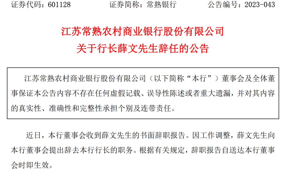 公告顯示,近日,因工作調整,付勁提出辭去副行長職務,薛文提出辭去行長的職務,莊廣強提出辭去董事長、董事會戰略與三農金融服務委員會主任委員的職務。同時,常熟銀行選舉薛文爲第七屆董事會董事長,聘任包劍爲行長,幹晴爲副行長。