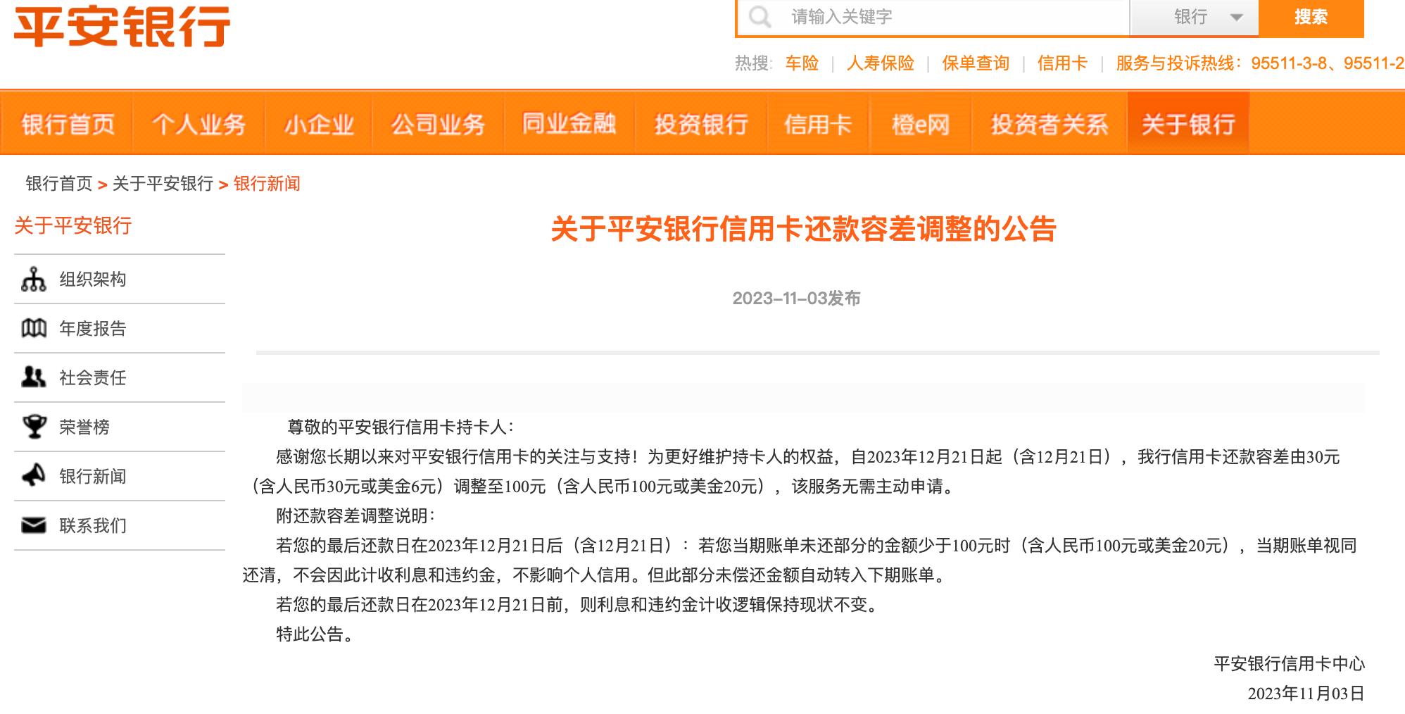 此外,11月3日,平安銀行發佈關於信用卡還款容差調整的公告,自2023年12月21日起,該行信用卡還款容差由30元調整至100元,且該服務無需主動申請。