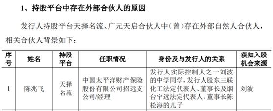 值得關注的是,在三聯化工退出了煙臺寧遠的投資後不久,三聯化工在2018年1月通過增資成爲六合寧遠的股東;在《審覈問詢函的回覆》中公司還披露,三聯化工董事長之子陳兆飛,是公司實控人之一劉波的中學同學,同時還是六合寧遠持股平臺中的外部合夥人。