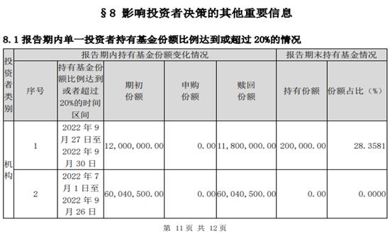造成華潤元大ESG主題混合C總份額大幅縮水的主要原因,據推測是來自於機構投資者的贖回。據三季報顯示,有兩家持有份額在20%以上的份額機構投資者,在三季度合計贖回了近7200萬份基金份額,其中一家清倉贖回6000多萬份,另一家贖回了1180萬份、僅剩餘20萬份。