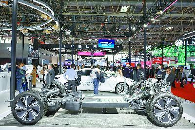 杭州時代電動科技有限公司的展臺上擺放着多款全球首發電驅動橋系統,作爲新能源汽車的核心部件,這些產品已遠銷歐美。展區負責人邵萬江告訴《環球時報》記者,單就一款產品來說,就需要上百家企業分工協作生產,少一個企業、一個零部件都無法完成。