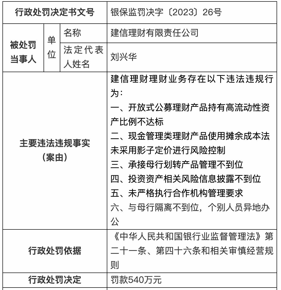 據金罰決字〔2023〕28號,興銀理財主要違法違規事實包括,一是理財產品之間進行利益輸送,二是開放式公募理財產品持有高流動性資產比例不達標,三是同業理財產品壓降不到位,四是未按規定開展理財業務內部審計,五是內控管理不到位,多數人員異地辦公,六是短期定期開放式理財產品投資資產違規使用攤餘成本計量,七是理財產品參與金交所業務存在違規問題,八是資管產品購買理財產品後導致出現多層嵌套。