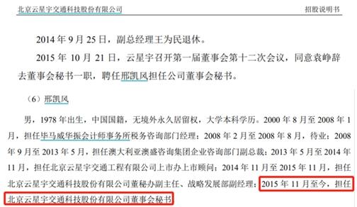 此外,雲星宇的董事會祕書爲邢凱風,根據2017版招股書披露,2015年10月21日,雲星宇召開第一屆董事會第十二次會議,同意袁崢辭去董事會祕書一職,聘任邢凱風擔任公司董事會祕書。但在本次申請上市的招股書披露,邢凱風“2015年11月至今,擔任北京雲星宇交通科技股份有限公司董事會祕書”,這與前次信息披露存在一個月的差異。