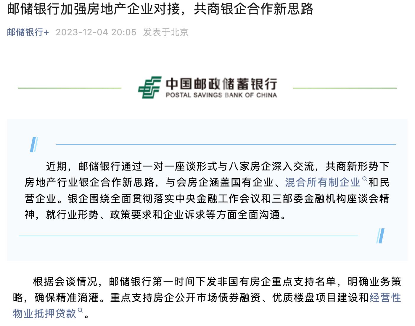 同日,郵儲銀行也發文稱,近期通過一對一座談形式與八家房企深入交流,共商新形勢下房地產行業銀企合作新思路,與會房企涵蓋國有企業、混合所有制企業和民營企業。郵儲銀行表示,下一步,一視同仁滿足不同所有制房地產企業合理融資需求,以“1+N”經營與服務新體系爲主線,做好房地產開發貸款、個人住房按揭貸款、債券承銷與投資等全方位綜合金融服務,進一步支持保障性住房等“三大工程”建設,紮實做好保交樓、保民生、保穩定各項工作,促進房地產市場平穩健康發展。