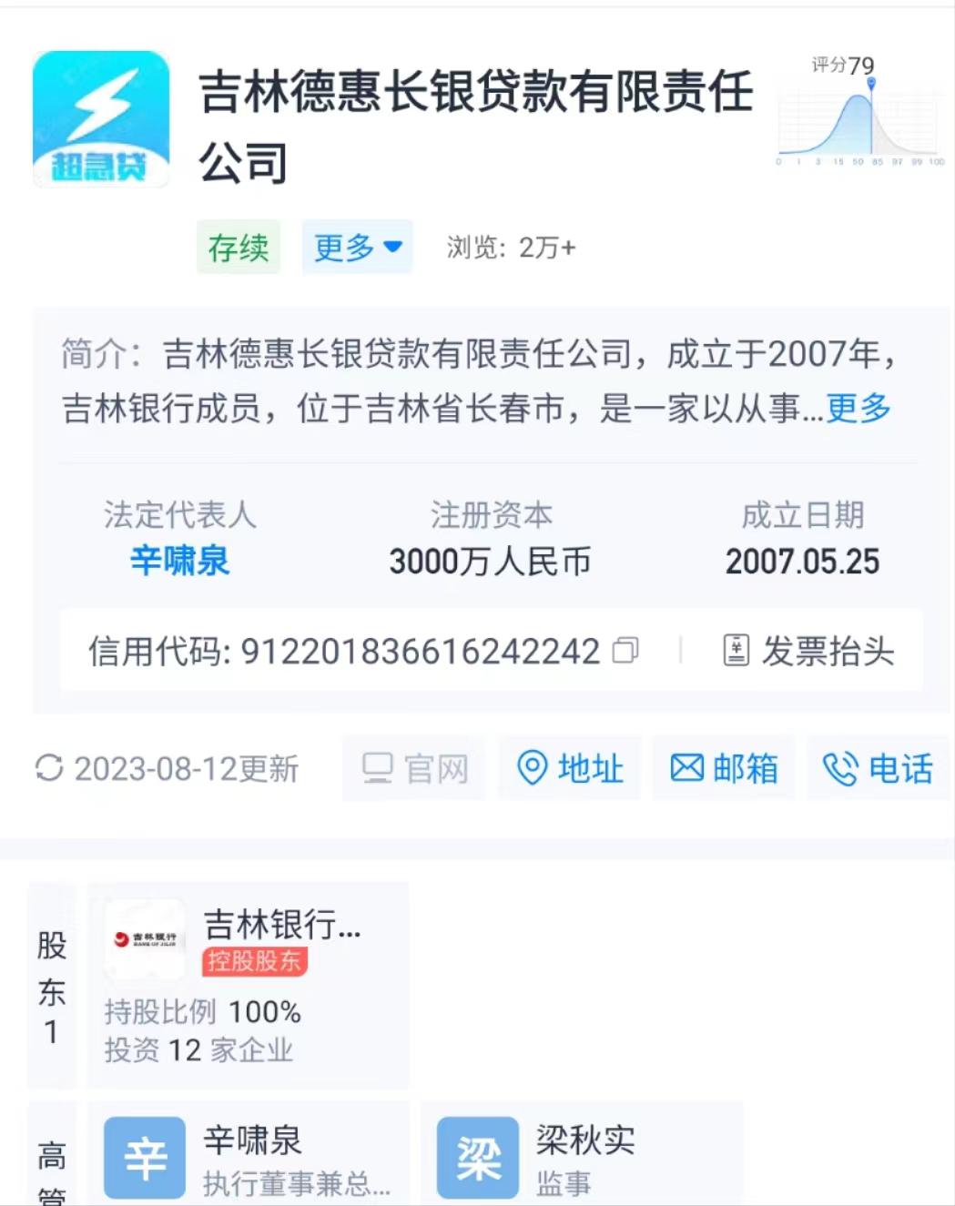天眼查資料顯示,吉林德惠長銀貸款公司成立於2007年,註冊資本3000萬元,股東爲吉林銀行,持股比例100%,法定代表人爲辛嘯泉。據吉林監管局批覆,今年1月,辛嘯泉獲批任吉林德惠長銀貸款公司總經理。