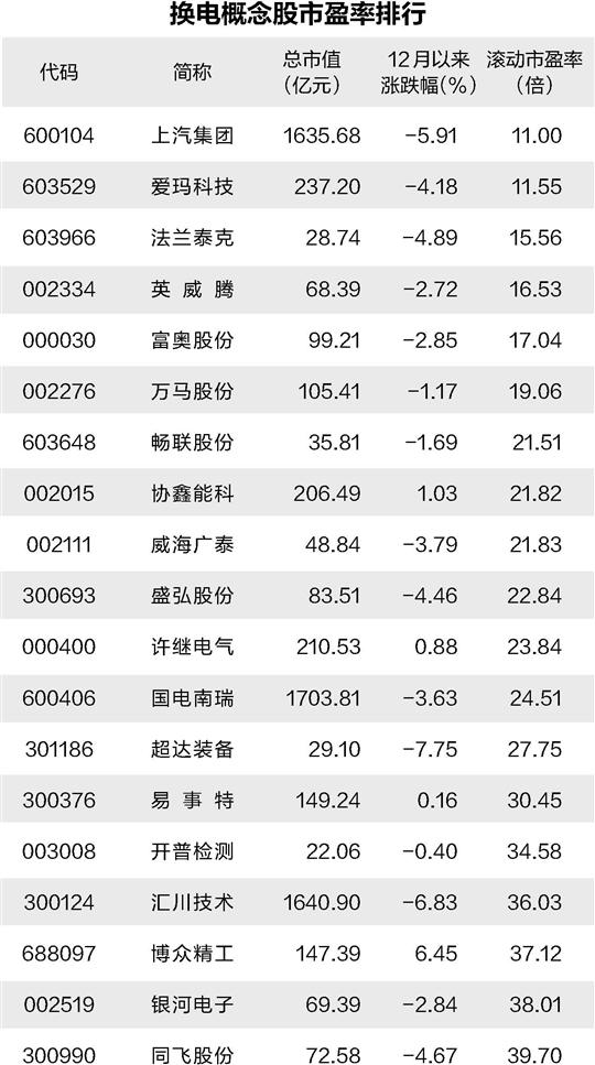 證券時報·數據寶粗略統計,A股市場共有60只個股涉及換電產業。截至12月12日收盤,這些概念股中,滾動市盈率低於40倍的有19只,上汽集團、愛瑪科技、法蘭泰克、英威騰、富奧股份、萬馬股份等均低於20倍。