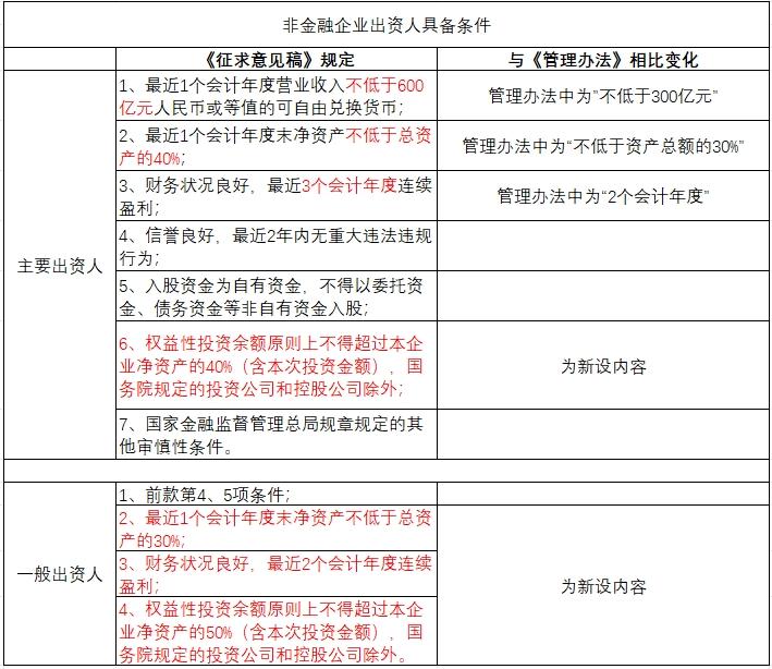 而在金融機構與非金融企業作爲出資人應具備的條件上,《徵求意見稿》在《管理辦法》基礎上做了調整。其中,《徵求意見稿》新增一項對權益性投資餘額的限制,如金融機構作爲主要出資人需權益性投資餘額原則上不得超過本企業淨資產的50%(含本次投資金額)。