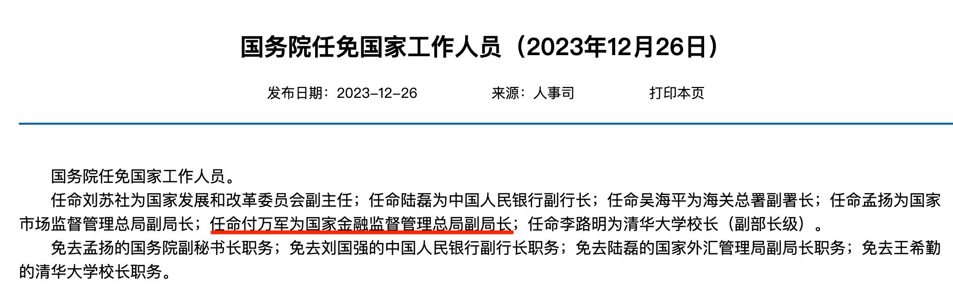 同時,據人社部網站發佈的國務院任免國家工作人員(2023年12月26日),任命付萬軍爲國家金融監督管理總局副局長。