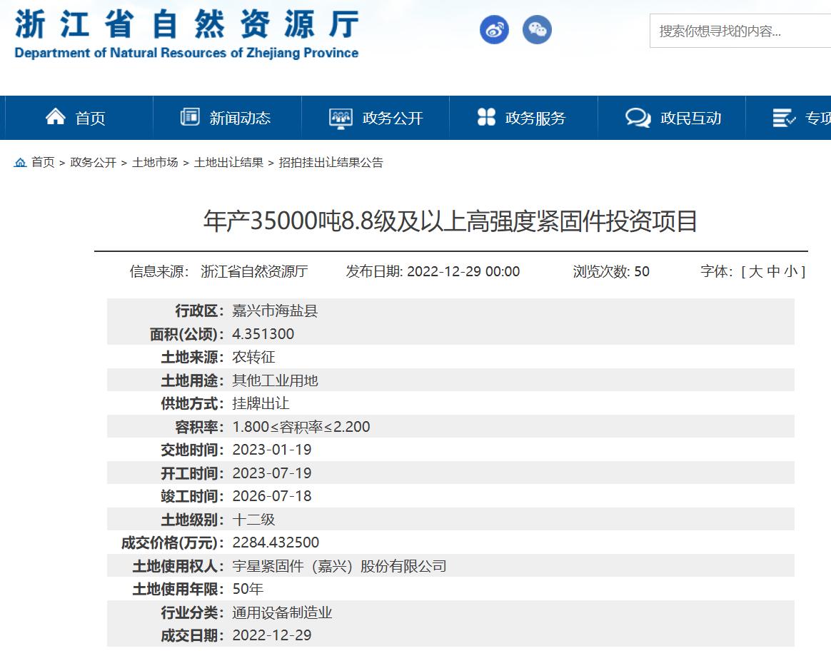 浙江省自然資源廳2022年12月29日公告也顯示,宇星股份通過掛牌出讓的方式取得4.3513公頃土地,用於年產3500噸8.8級以上高強度緊固件投資項目。信息顯示,該地塊交地時間2023年1月19日,開工時間2023年7月19日,竣工時間2026年7月18日,建設期是3年而並非2年。