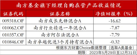 無獨有偶,2023年5月30日,南方基金宣佈,基金經理王博、駱帥、張延閩、李錦文分別申購各自管理的基金,金額均100萬元,對應產品爲南方成長先鋒混合、南方行業精選一年混合、南方阿爾法混合、南方卓越優選3個月持有混合。