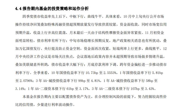 而德邦景頤債券在第四季報中提到,四季度債市收益率先上後下,中樞下行,曲線牛平。