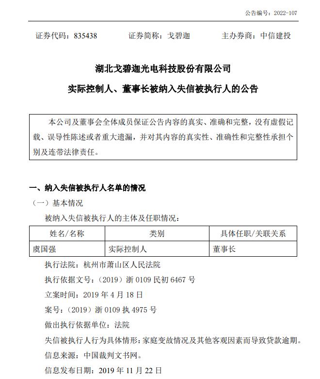 2019年,浙商銀行股份有限公司杭州蕭山支行因戈碧迦董事長虞國強欠錢不還將其告上法庭。2019年 5月 17日,杭州市蕭山區人民法院判決虞國強返還借款2,499,860.69元及支付相應的利息、罰息。因虞國強未在規定期限內履行法院判決,杭州市蕭山區人民法院於2019 年8 月1 日作出《失信決定書》,將虞國強列爲失信被執行人,失信期爲2 年,並限制高消費。但彼時戈碧迦公司並未予以公告。