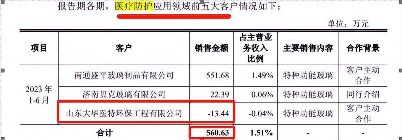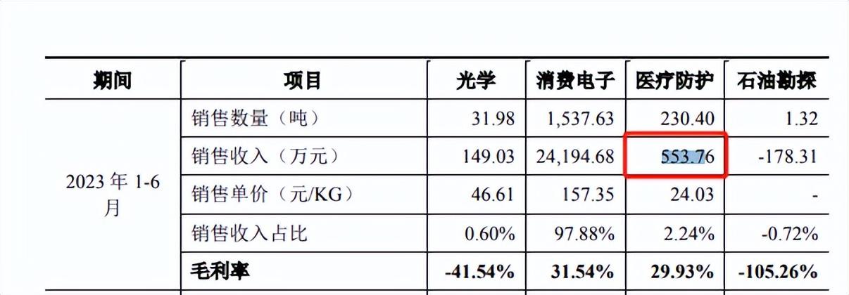 戈碧迦所生產的光學玻璃及特種玻璃的應用領域之一是醫療防護領域。招股書上會稿235頁顯示,2023年1-6月,戈碧迦在該領域有3家客戶,總銷售金額合計560.64萬元;但298頁又顯示,2023年1-6月公司在醫療防護領域的銷售收入爲553.76萬元,同一數據相差6.88萬元。