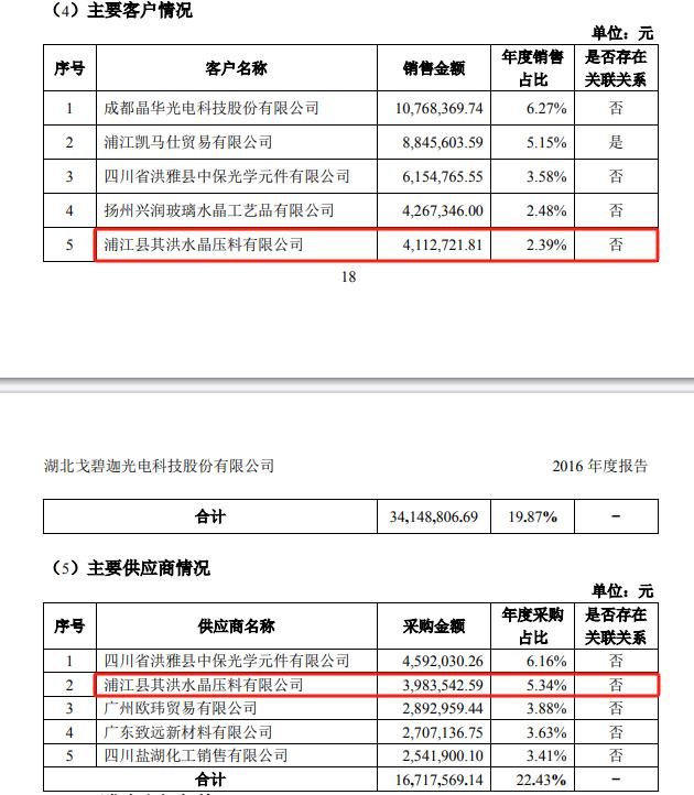 天眼查相關信息顯示,吳其洪還是浦江縣其洪水晶壓料有限公司的實控人,該公司註冊地和經營地也是浦江縣經濟開發區一點紅大道180號,且與戈碧迦存在同業競爭。戈碧迦2016年年度報告還顯示,浦江縣其洪水晶壓料有限公司既是公司當年的第五大客戶,又是第二大供應商。