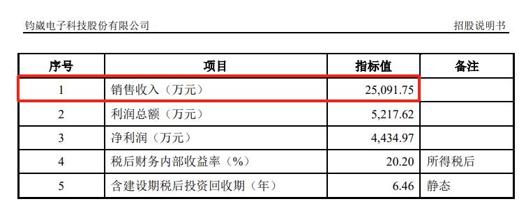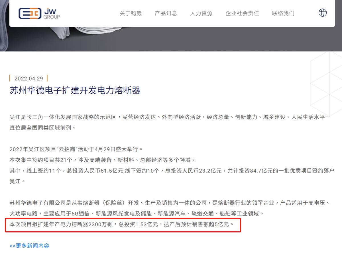 招股說明書稱,該項目達產預計銷售收入2.509億元。但鈞崴電子官網介紹,2022年吳江區項目“雲招商”活動於4月29日盛大舉行,蘇州華德電子有限公司擬擴建年產電力熔斷器2300萬顆,總投資1.53億元,達產後預計銷售額超5億元。同一項目達產後產值預測值差一倍,而差異原因鈞崴電子並未說明。