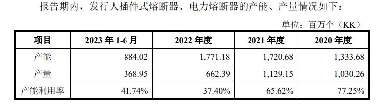 數據顯示,2022年,鈞崴電子熔斷器自產7.85億個,外協產量2.98億個,合計10.83億個。外協產量佔比27.5%,較前一年大幅提高。但與鈞崴電子披露矛盾的是,2022年公司並未出現自有產能無法滿足大量訂單的情況,相反當年公司熔斷器、電力熔斷器產能利用率僅爲37.40%,較2021年的65.62%還大幅下跌28.22%。
