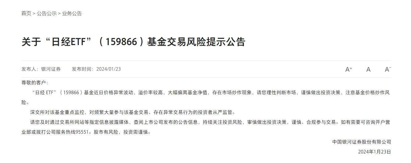 此外,當日,中國銀河證券單獨發佈關於“日經ETF(159866)”基金交易風險提示,該只基金近日價格異常波動,溢價率較高,大幅偏離基金淨值,存在市場炒作現象。深交所對該基金重點監控,對頻繁大量參與該基金交易、存在異常交易行爲的投資者從嚴監管。