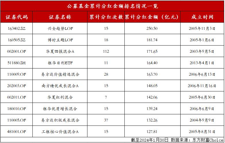 從分紅金額上來看,興全趨勢LOF累計分紅金額達250.5億元。此外,博時主題LOF、華夏回報混合A、銀華日利ETF、易方達價值精選混合排在其後,分紅規模分別爲181.74億元、171.65億元、164.4億元、163.7億元。