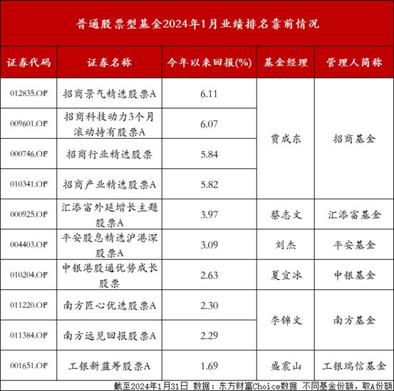 而萬家高端裝備量化選股混合發起式A以7.4%收益排在偏股混合基金業績第二名。再然後,又是來自於永贏基金,旗下永贏長遠價值混合A於今年1月收益達6.71%。除此之外,收益前10名中還有德邦週期精選混合A、中泰紅利優選一年持有混合發起、招商成長LOF、上銀鑫卓混合A等。