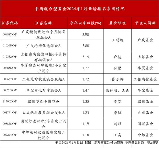 相較其他三類基金,平衡混合基金業績表現遜色,廣發穩健優選六個月持有期混合A收益最高,爲3.98%,由王明旭擔任基金經理。而他管理的另一隻產品——廣發均衡優選混合A同期收益率3.88%,排在第二名。此外,還有一隻基金淨值增長率超過3%,爲上銀鑫尚穩健回報6個月持有期混合A,而排在其後的產品回報出現斷檔,華夏安泰對沖策略3個月定開混合、工銀絕對收益混合發起A收益率分別爲1.77%、1.72%。